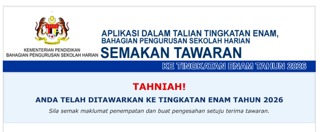 Kementerian Pendidikan Mlalaysia kini membuka semakan tawaran Tingkatan 6 bagi sesi akademik 2026. Tawaran ini adalah bagi pelajar lepasan SPM 2025.